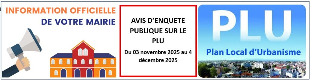 L’enquête publique sur la révision générale du Plan Local d’Urbanisme (PLU) de Saint-Julien aura lieu du lundi 3 novembre 2025 au jeudi 04 décembre 2025. Cliquer ici pour consulter l’avis d’enquête. Le dossier d’enquête publique ainsi qu’un registre dématérialisé permettant de faire parvenir ses remarques au Commissaire Enquêteur sont disponibles en cliquant ici.